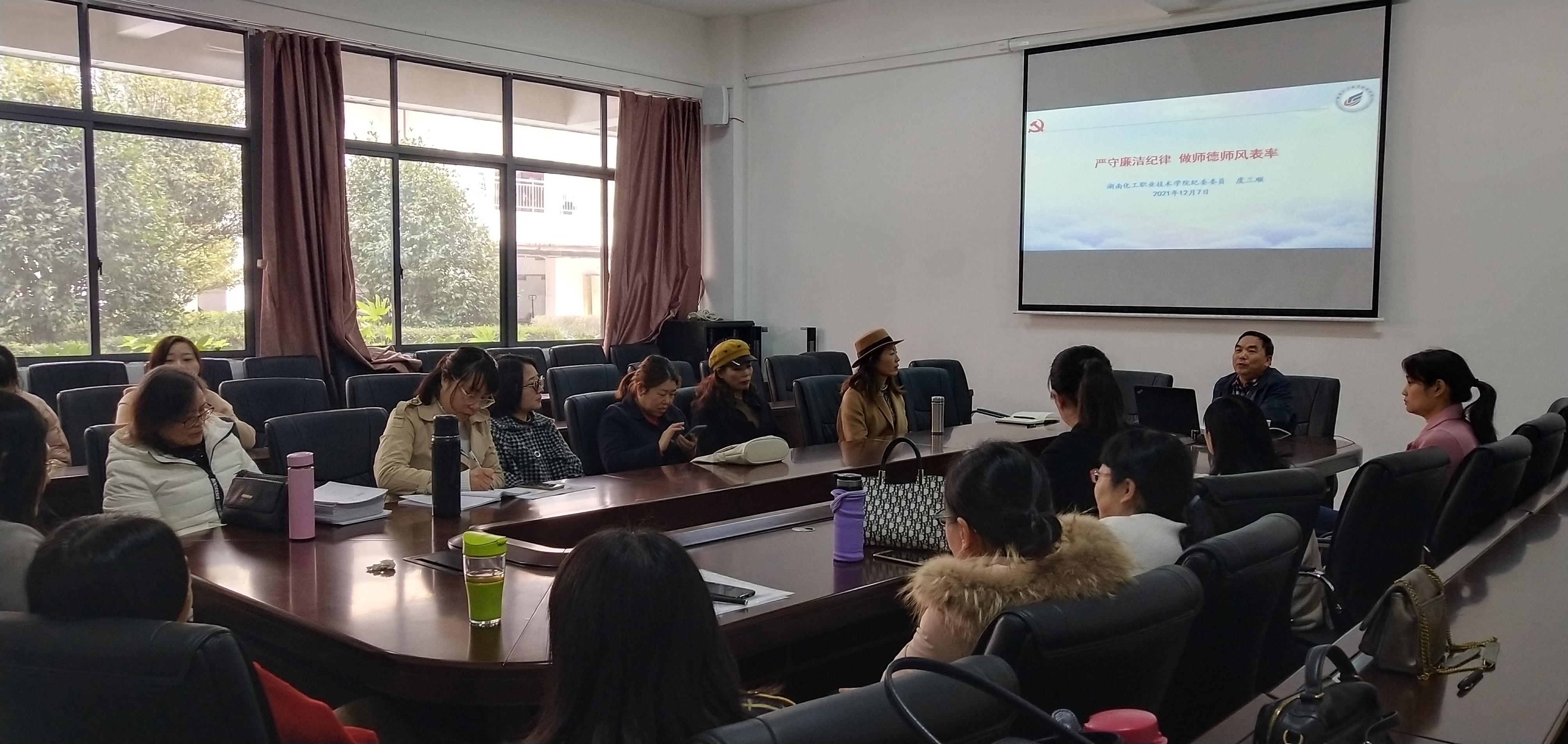 12月7日下午,基础课部党总支组织全体教职工在部门会议室开展廉政教育及师德师风教育。学校纪委委员、审计处处长虞三顺以《严守廉洁纪律 做师德师风表率》为题做廉政教育及师德师风专题讲座。虞处长以“廉洁纪律和师德师风”为主线,从加强师德师风建设的背景、32条师德师风负面清单、39种违反廉洁纪律的行为和高校违纪违法典型案例警示四个方面展开讲述。进一步传达全国师德师风会议精神,引领大家深入学习习近平总书记关于“四有好老师”“四个引路人”“四个相统一”的重要论述,重温中央八项规定、省委“九项规定”、学校十条禁令的精神。