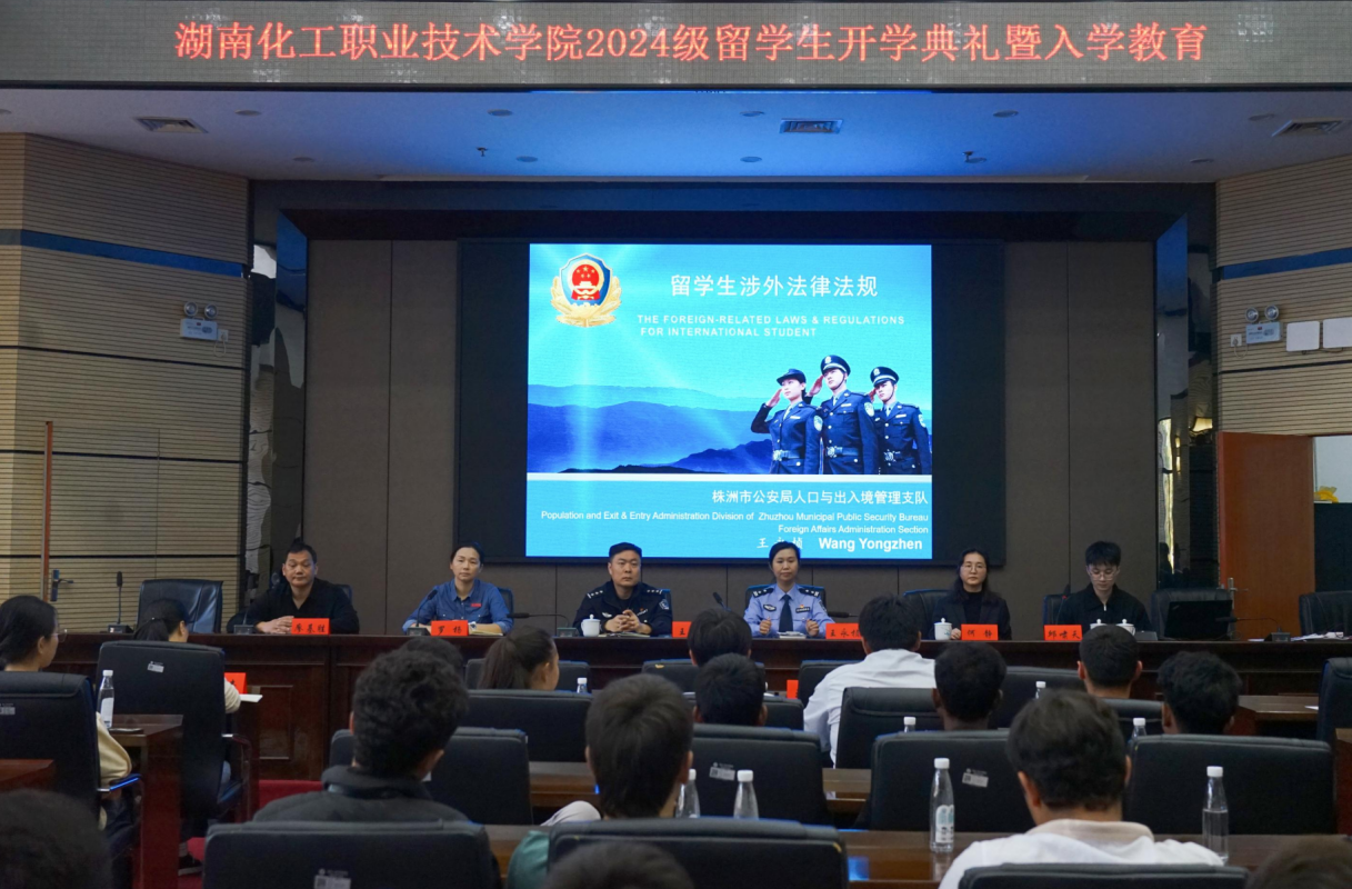 校长隆平、副校长刘艳、田伟军,株洲市公安局人口与出入境管理支队副大队长王永桢、警官王玥,职教城派出所副所长王方以及学校宣传统战部、学生工作部、保卫部、教务处、对外交流处、后勤处等职能部门负责人及商务贸易学院领导与相关教师出席开学典礼,共同迎接留学生的到来。会议由商务贸易学院副院长何静主持。