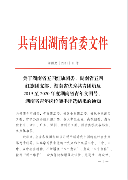 日前,根据共青团湖南省委相关文件通知,我校团委荣获“湖南省五四红旗团委”荣誉称号。这是对我校坚持以党建带团建,推动共青团工作新发展的充分肯定,也是对全校各级团组织和广大团员青年的激励与鼓舞!