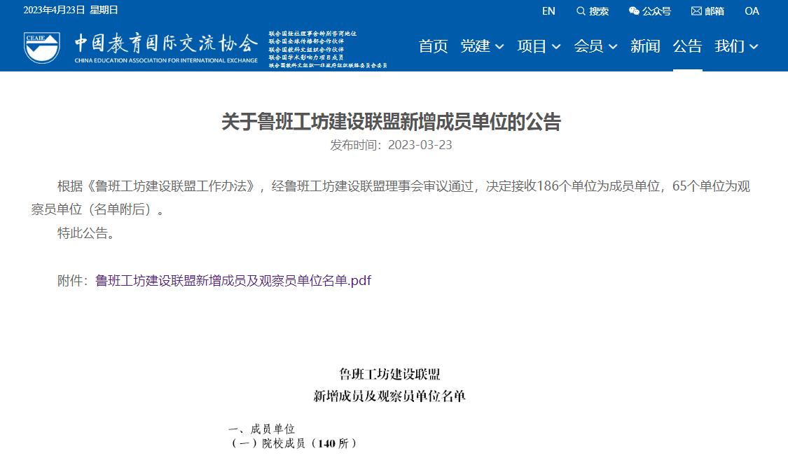 近日,中国教育国际交流协会官网发布了《关于鲁班工坊建设联盟新增成员单位的公告》,在学校前期积极申报基础上,经鲁班工坊建设联盟理事会审议通过,学校成功入选为鲁班工坊建设联盟成员单位。该联盟由教育部牵头发起成立,是中国院校、企业、科研机构和社会组织自愿结成的全国性、非营利性合作组织,主要开展鲁班工坊标准制定、项目建设、质量保障、能力建设等工作。首批召集72家成员单位,本批接收186家成员单位(含140所院校成员、46家企业成员)。