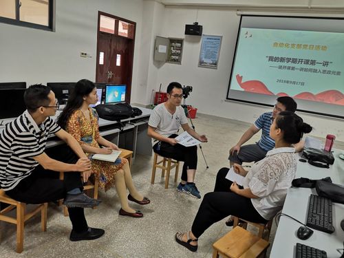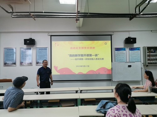 为落实课程思政要求,推动立德树人向纵深推进,9月17日,自信学院自动化党支部分自动化专业和电气专业两个小组分别在自信楼506、410室开展了"我的新学期开课第一讲"说课暨主题党日活动。活动中,各党员首先就新学期开课第一讲如何开展课程思政进行深入交流,针对不同的课程,探讨如何将社会主义核心价值观、工匠精神等的培养贯穿教学过程,然后进行集体备课。