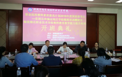 10月12日,由省教育厅主办、湖南化工职业技术学院承办的职业院校教师素质提高计划2018年国家级项目--贫困县和偏远地区学校精准培训项目在醴陵陶瓷烟花职业技术学校顺利开班。醴陵陶瓷烟花职业技术学校党委书记及校长徐峰、校长助理朱树桃,湖南化工职业技术学院副校长隆平、教务处处长田伟军、教务处副处长曹红玲和醴陵陶瓷烟花职业技术学校30名参培教师及部分旁听教师参加了开班典礼。开班典礼由朱树桃主持。