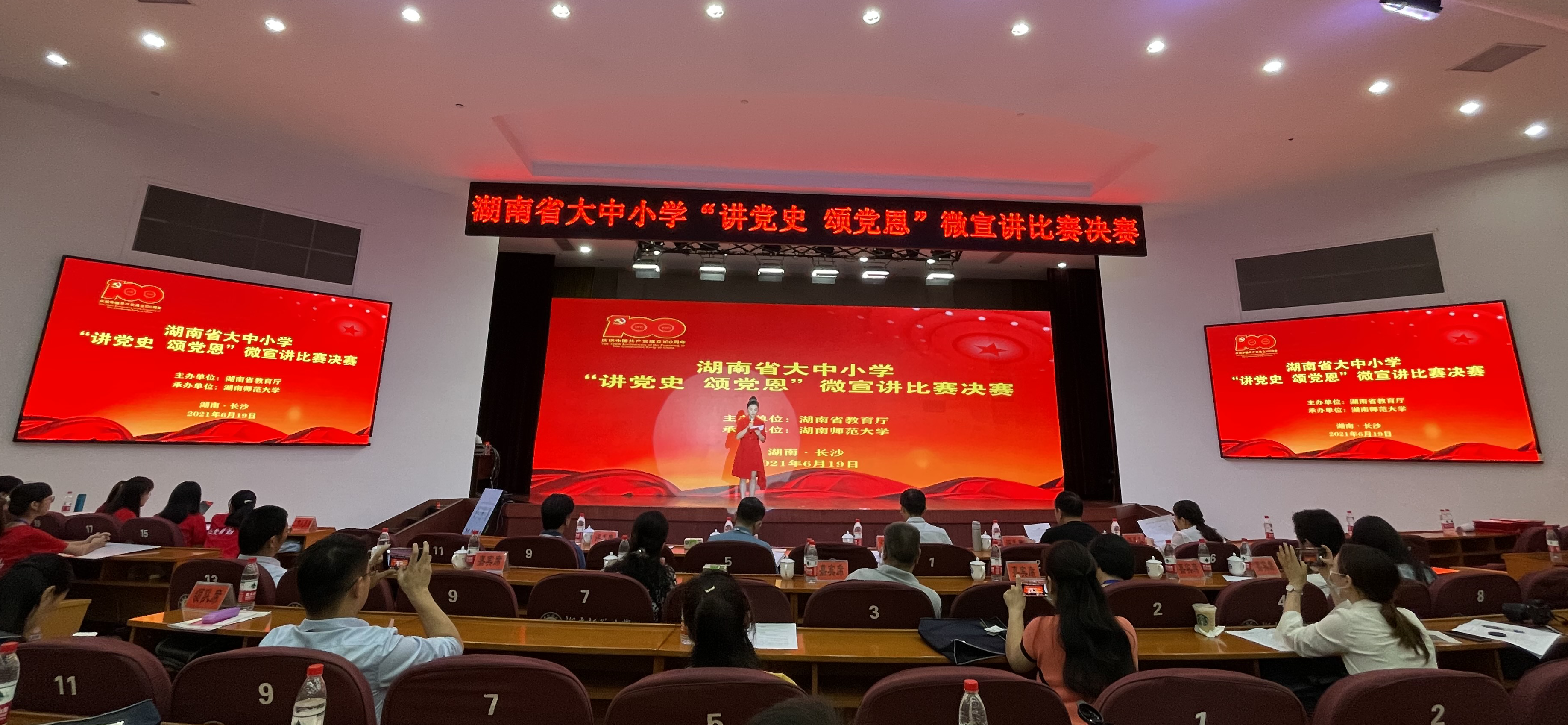 为推动全省大中小学深入学习贯彻习近平总书记关于学习党史的重要论述,全面准确阐释好、解读好党的不懈奋斗史、为民服务史、理论创新史、精神锻造史、自我革命史和党的湖南发展史,6月19日,湖南省大中小学“讲党史 颂党恩”微宣讲比赛决赛在湖南师范大学国际学术报告厅落下帷幕,我校罗杨老师的《一封没有寄出的信》荣获高校教师组二等奖。