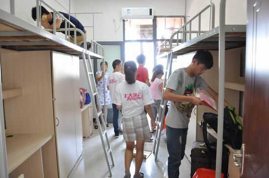 志愿者对新生妈妈说:“您在我们的书店休息,看看杂志,我的同学会带着学弟完成缴费流程,稍后我们再一起去宿舍吧。”妈妈开心地笑了。