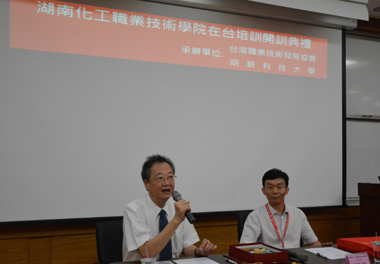 7月13日上午10点,我院赴台研习班在台湾明新科技大学行政楼哈佛讲堂举行了开训典礼。我院21名研习班成员和台湾明新科技大学相关管理人员及台湾职业技术发展协会秘书长郭莉女士出席典礼。明新科大校长袁保新教授致欢迎词,我院易卫国副院长致谢辞,并与袁校长互赠礼物。