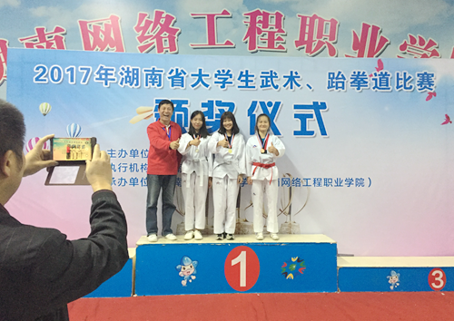 10月31日,由湖南省教育厅主办的2017年全省大学生跆拳道、武术比赛在湖南网络工程职业学院拉开帷幕。我校跆拳道队首次参加本次比赛,虽然高手如云,竞争激烈,但我校参赛选手在教练老师童双、钟欣的悉心指导下,在选手们的顽强拼搏下,最终斩获2金5银2铜,取得团体总分第二名的好成绩,为学校再添荣光。