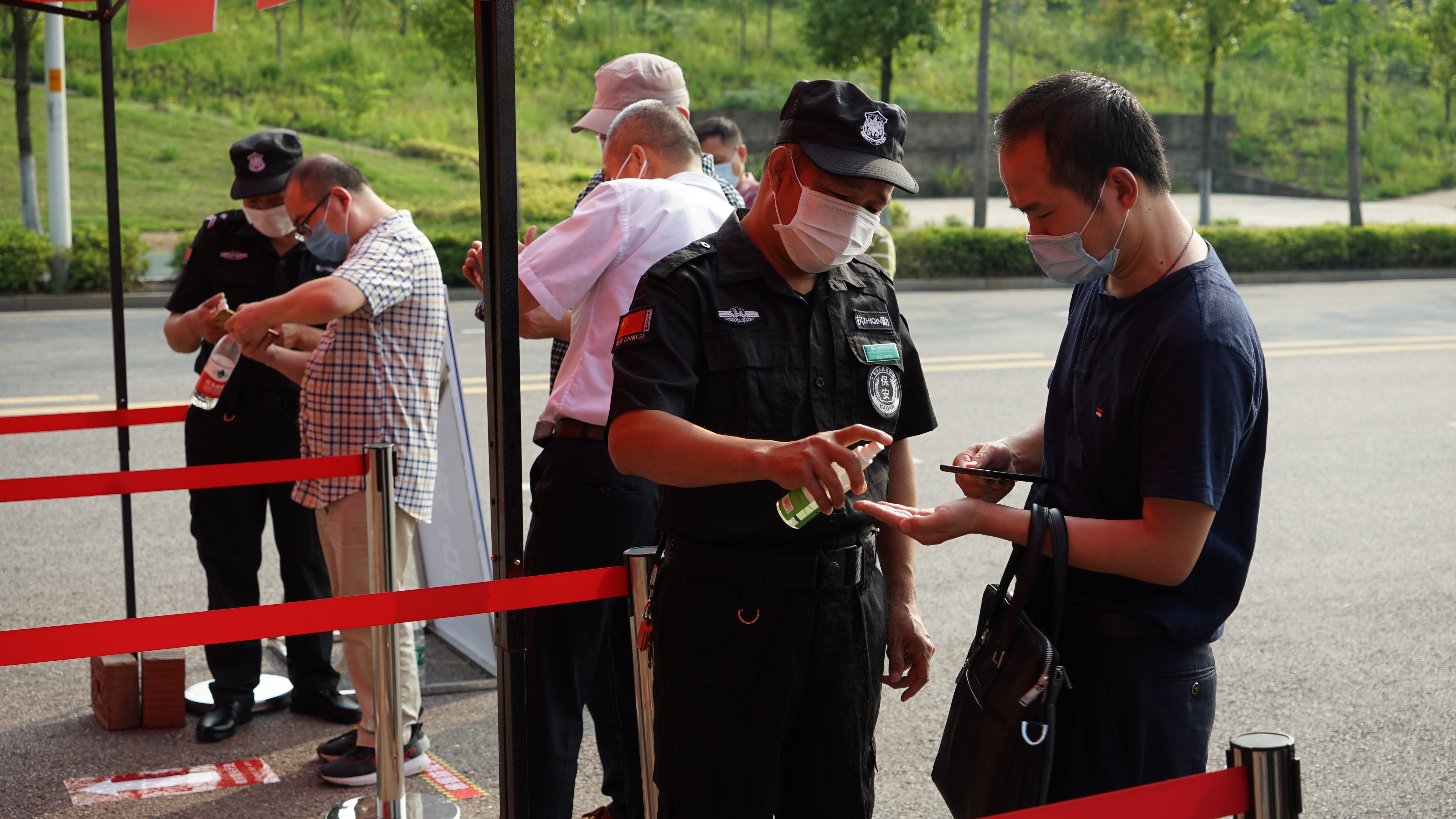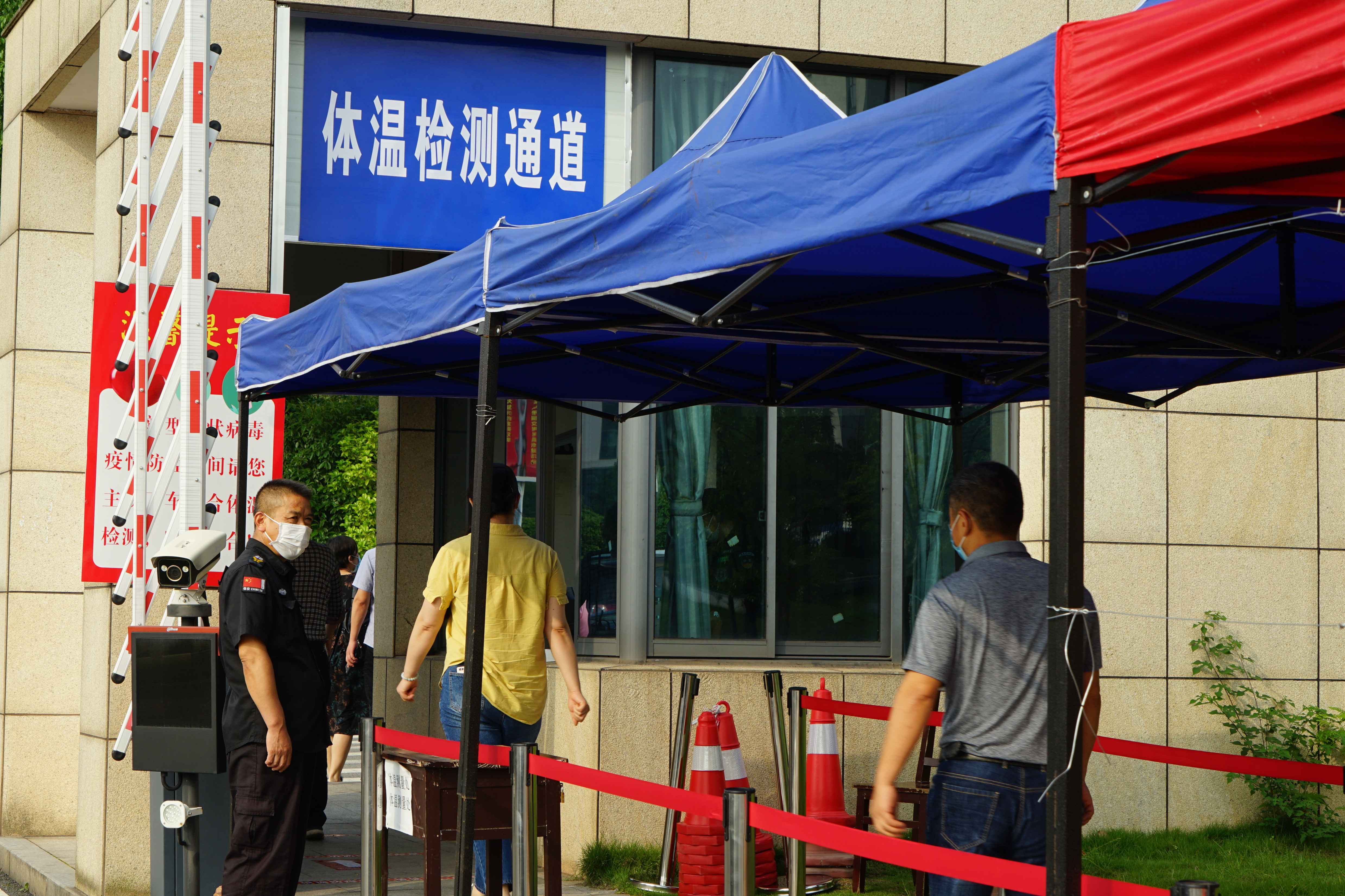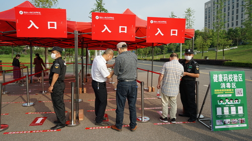 学校正门设立了考生通道、测温区、复测区、隔离区,并设有1米的前后标识线和点,工作人员在入口处查验口罩佩戴、考生当日健康码和准考证,有序引导考生进入。考生进入考点时应主动出示当日居民健康卡绿码进入,并全程佩戴口罩,严格接受体温检测,服从工作人员引导、指挥,主动与他人保持1米以上的社交距离。