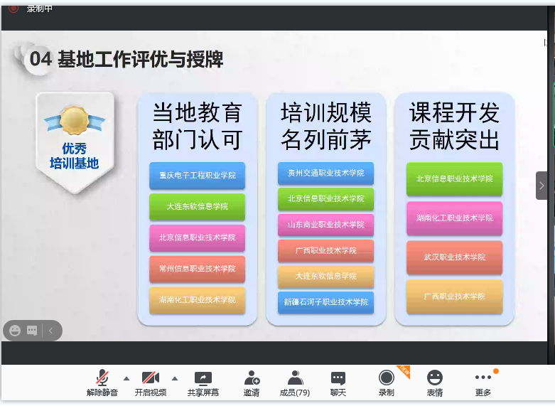 2021年1月15日,信息化教指委以腾讯会议形式召开了“信息化联培基地2020年工作总结会”。在会上,信息化教指委充分肯定了我校联培基地工作。我校培训工作因得到当地教育部门高度认可和培训课程开发贡献突出,荣获优秀培训基地,并同时获“职业院校信息化培训基地”第一批授牌单位。