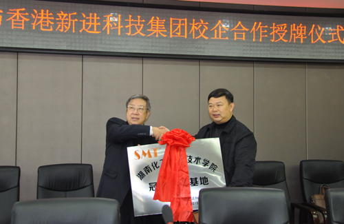 最后,校企双方领导人相互授牌。陈其镳董事长代表香港新进科技集团有限公司向我院经济管理系、自动化与信息工程系分别捐赠校企订单培养经费5万元和3万元。