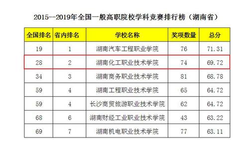 2020年2月22日,中国高等教育学会《高校竞赛评估与管理体系研究》专家工作组发布2015-2019年和2019年全国普通高校学科竞赛排行结果,包含本科院校榜单12个,高职院校榜单11个,省份榜单2个。在2015-2019年全国普通高校学科竞赛评估结果(高职)TOP300排名中,湖南省上榜二十所高职院校。湖南化工职业技术学院以获奖数量74项、总分69.72分的成绩位列全国第86名,湖南省第4名。在2015--2019年全国一般高职院校学科竞赛排行榜(高职)TOP100排名中,湖南省上榜七所高职院校,湖南化工职业技术学院位列全国第28名,湖南省第2名。