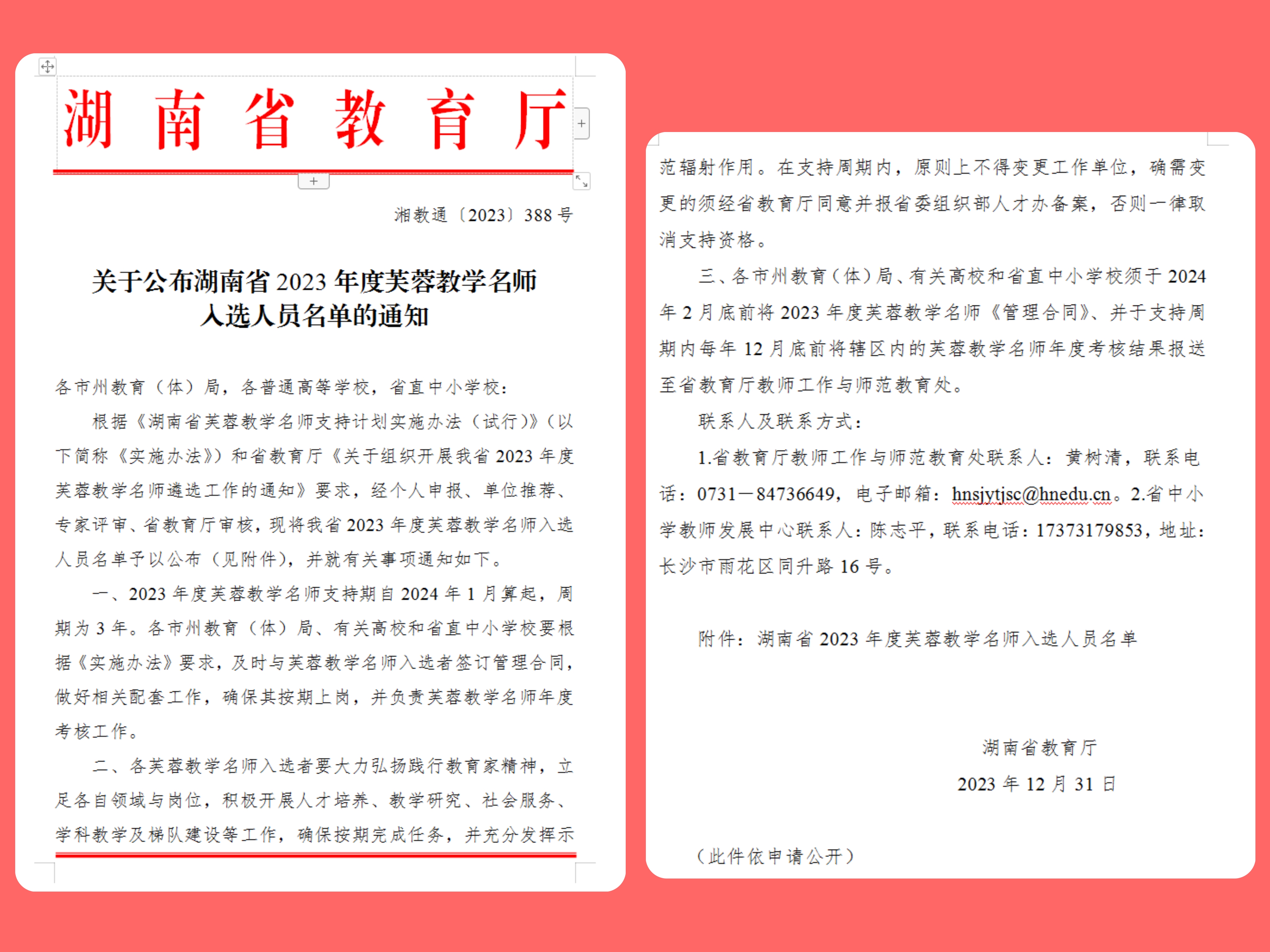喜报:我校教师入选湖南省2023年度芙蓉教学名师