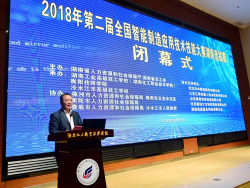 10月29日下午,第二届全国智能制造应用技术技能大赛湖南赛区选拔赛在湖南化工职业技术学院闭幕。湖南省人社厅副巡视员吕志纲,省总工会副巡视员王湘静,株洲市人民政府副市长杨胜跃,衡阳技师学院院长邱家才,湖南化工职业技术学院党委书记刘望,株洲市人社局局长蒋湘晖,省人社厅鉴定中心主任廖云飞,株洲市云龙示范区党工委书记蔡周良等省市领导,参赛队和技术支持单位代表参加闭幕式。