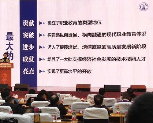 鲁昕会长到会作了热情洋溢的致辞。教育部职业教育与成人司副司长周为作了题为“深入学习五中全会精神 建设高质量职业教育体系”的报告,周为从总书记对职业教育的重要地位、使命职责、办学方向、育人机制、价值追求、舆论导向等方面的重要论述进行讲解,并总结了“十三五”期间职业教育取得的诸多成就,以及“十四五”期间要处理好的五个关系及着力做好的十一项重点工作。