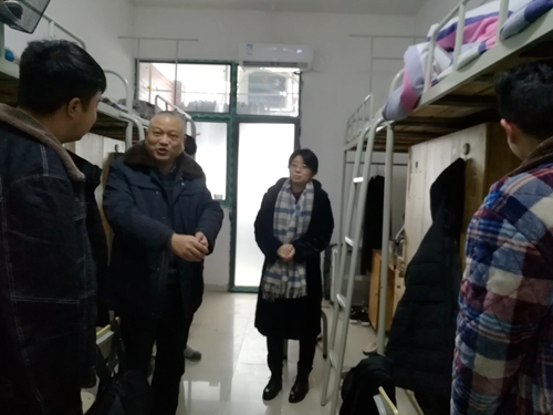 雪,一直在下。将近中午时,校长王雄伟和副校长胡颖蔓带领保卫处处长王湘平、学工处副处长欧彦麟和机电学院党总支副书记蒋晓斌等部门及二级学院相关负责人到了学生宿舍看望节日在校学生。