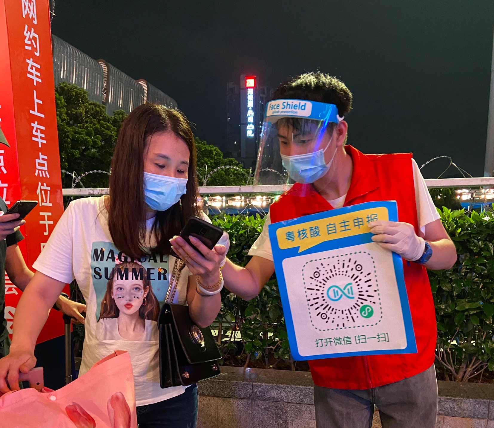 8月7日晚上6点,在深圳北站出口,我校自动化1912班徐俊杰同学正在维护乘客秩序,检查每一位排队进行核酸检测人员的健康码,并测量体温,提醒他们“出示健康码,带好口罩” ,引导乘客完成核酸检测步骤。短短的一句话在几个小时里重复了几百遍,忙忙碌碌连水都顾不上喝。