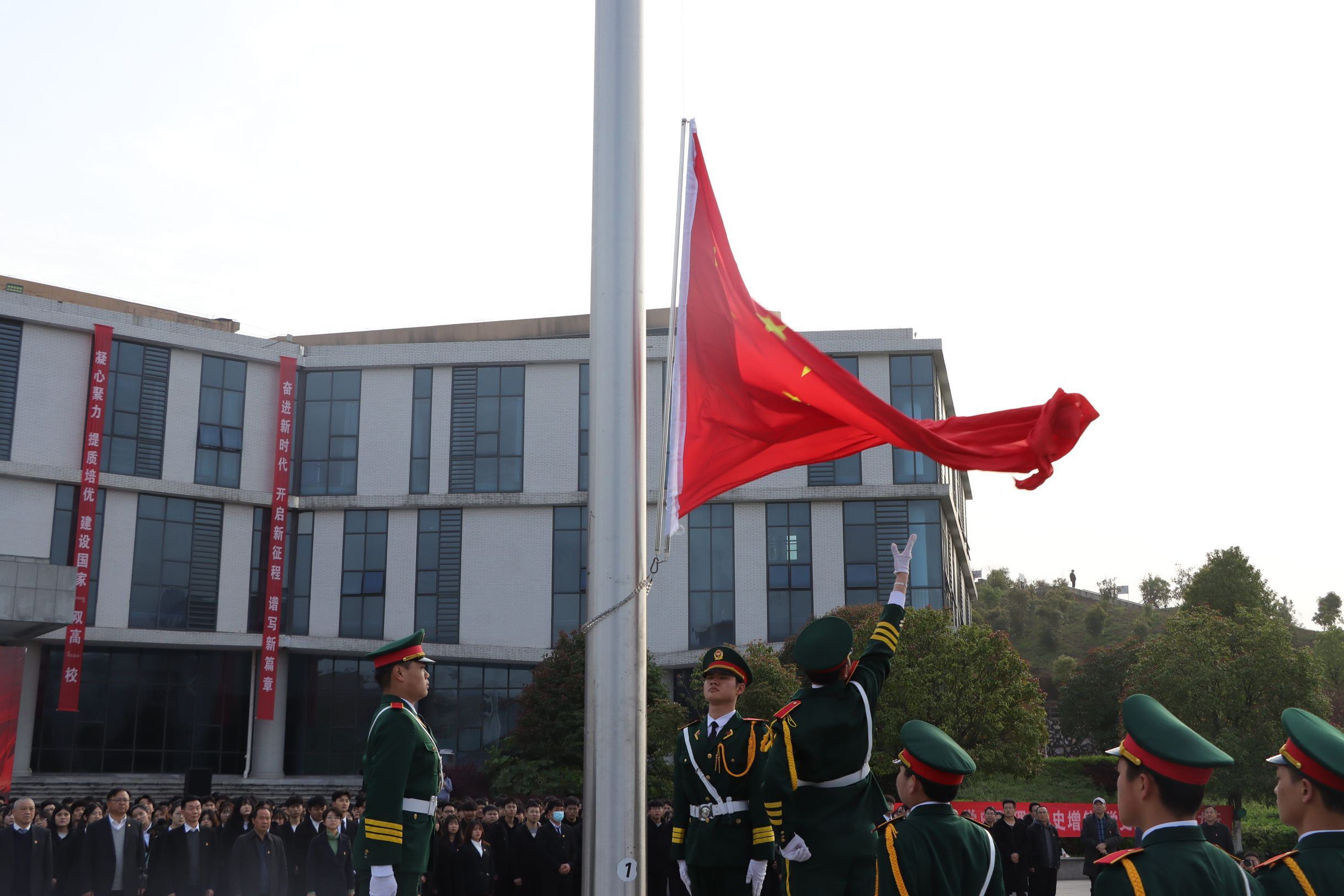 7点20分,国旗护卫队的旗手们着装整齐,迈着矫健的步伐,护着鲜艳的五星红旗入场举行升旗仪式。伴着《义勇军进行曲》的响起,全体唱国歌,行注目礼,庄严肃穆。