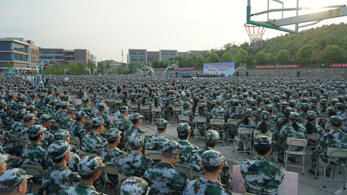 军训总教官胡滨宣布军训作息时间和纪律。他表示,将严格要求、科学施教,帮助新生学有所获。希望同学们珍惜这次军训机会,不怕艰苦、严格训练,把军训经历定格在成长成才的轨迹中,转化为报效祖国的强大正能量。