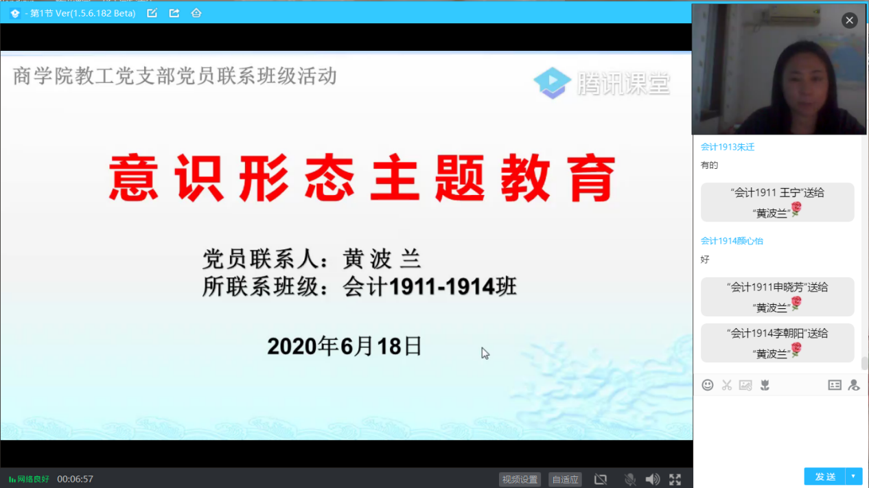 作为会计1911~1914班的党员联系人,商学院教工党支部书记黄波兰于6月18日晚7点利用腾讯课堂进行了一次意识形态主题教育,会计1911~1914班全体同学参加。
