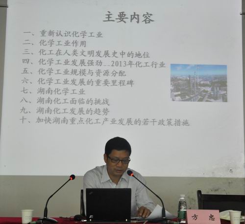 方忠在讲座中提出,要跳出湖南化工看化工,要站在经济发展、湖南发展的角度来看化工,用发展的眼光、挑战的眼光来重新认识化学工业,他主要从十个方面进行了阐述。谈到重新认识化学工业,他认为化工是强国产业、强省产业,也是朝阳产业。他引用联合国利马宣言中的话,指出化工是基础产业,同时也是支柱产业,是民生产业,与现代人的生活息息相关。化工既是知识密集型产业,也是资本密集型产业,还是资源和能源密集型产业,是新兴工业化与战略新兴产业发展的基石。在世界百强企业中,化工占了二分之一以上,美国真正创造财富和效益的产业中就包括化工产业。韩国、新加坡、台湾等都是以化工发展为跳板进入经济发达国家和区域行列的。可以说,化工产业工人在国外几乎不会失业,永远属于朝阳产业。方忠同时也提到了化工行业的特点和作用,对国家GDP所做的贡献,他以育种薄膜、环保化工对建材的支撑为例,谈到新农业、新能源的建设与开发,谈到化工的“双刃剑”作用,以及它与社会发展各方面需要的密切关系,阐明了化工在国民经济中所占的重要地位和它的不可替代与持续发展性。他从青铜时代到高分子时代,再到硅材料与IT时代入题,谈到改变21世纪的材料石墨烯时代的来临,列举了化工在人类文明发展史上的地位。从2013年我国化工行业的状况,谈到化学工业发展的强劲动力,谈到化学工业规模与经济分配的关系,以及化学工业发展的重要里程碑,详细分析了湖南化学工业的发展与挑战,以及当前发展的重大机遇,分析了湖南化工的发展趋势,谈到加快湖南重点化工产业发展的若干政策措施,其中就有积极引导本省化工类高职院校积极发挥在建设生态文明和绿色化工中的作用。
