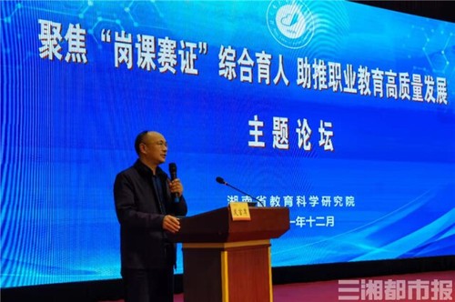 “职业教育主题论坛是湖南省教育科学研究院的四大主题论坛之一,已经持续近20年。今年的论坛以‘聚焦岗课赛证综合育人 助推职业教育高质量发展’为主题,不仅对接了当前国家职业教育发展的重大举措,而且适应了湖南经济社会发展的重大战略。”在湖南省教育科学研究院院长石灯明看来,“岗课赛证”综合育人有望彻底改变现在校企合作“合而不作”、产教融合“融而不通”的现状。他认为,“岗课赛证”综合育人就是在满足学生个性化和多样化需求的同时,实现学生所学即所用,毕业即上岗的技术技能人才培养目标;同时,进行校校合作、校企合作,重构符合高素质技能技术人才培养的精品课程与教材,培养适应市场需求的复合性人才,为服务“三高四新”战略,提供高素质技能技术人才支撑。