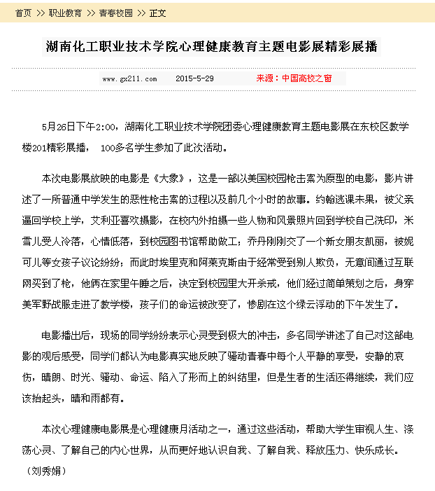中国高校之窗:湖南化工职业技术学院心理健康教育主题电影展精彩展播