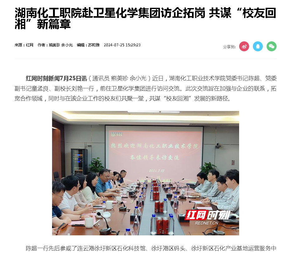 红网:湖南化工职院赴卫星化学集团访企拓岗 共谋“校友回湘”新篇章