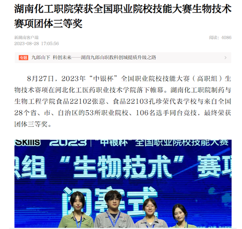 新湖南:湖南化工职院荣获全国职业院校技能大赛生物技术赛项团体三等奖