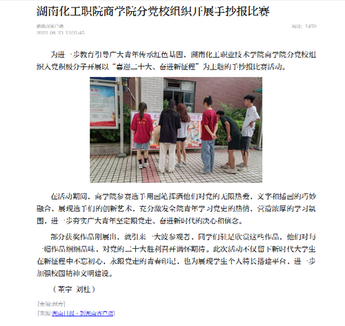 为进一步教育引导广大青年传承红色基因,湖南化工职业技术学院商学院分党校组织入党积极分子开展以“喜迎二十大、奋进新征程”为主题的手抄报比赛活动。