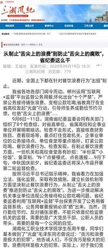 按照习近平总书记指示精神,我省着力在加强立法、强化监管、采取有效措施、建立长效机制等方面坚决制止餐饮浪费行为,从制止“舌尖上的浪费”推进到防止“舌尖上的腐败”。为进一步推动解决机关事业单位违规公务接待和公款吃喝问题,省纪委监委利用“互联网+监督”平台探索开发了公务用餐监督系统,公务用餐要报销必须“晒”出来。当然,厉行勤俭节约、反对铺张浪费,不能只依靠纪检监察机关的监督,需要的是广大党员干部、公职人员的带头,需要的是每一个公民的自觉。
