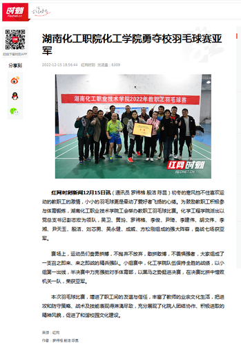红网时刻新闻12月15日讯(通讯员 罗祎格 殷洁 陈昆)初冬的寒风挡不住喜欢运动的教职工的激情,小小的羽毛球更是牵动了爱好者飞扬的心绪。为鼓励教职工积极参与体育锻炼,湖南化工职业技术学院工会举办教职工羽毛球比赛。化学工程学院派出以党总支书记彭志宏为领队,吴卫、黄玲、罗祎格、李俊、尹琦、李建伟、胡文伟、李湘、尹天玉、殷洁、刘芯男、吴永健、成威、方松刚组成的强大阵容,奋战七场获亚军。