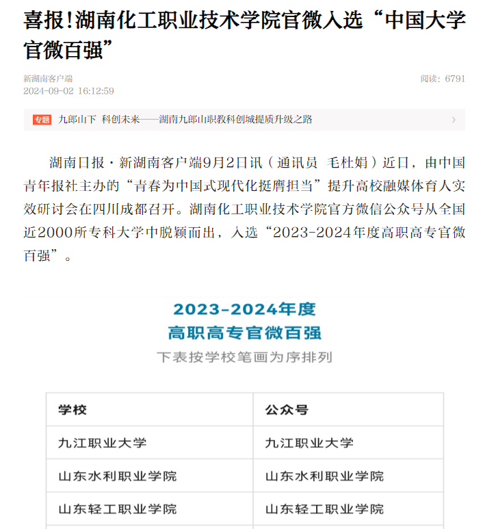 新湖南:喜报!湖南化工职业技术学院官微入选“中国大学官微百强”