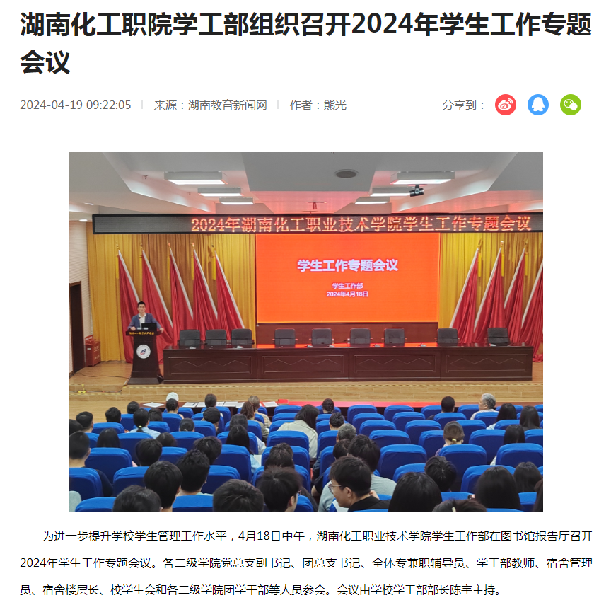 湖南教育新闻网:湖南化工职院学工部组织召开2024年学生工作专题会议