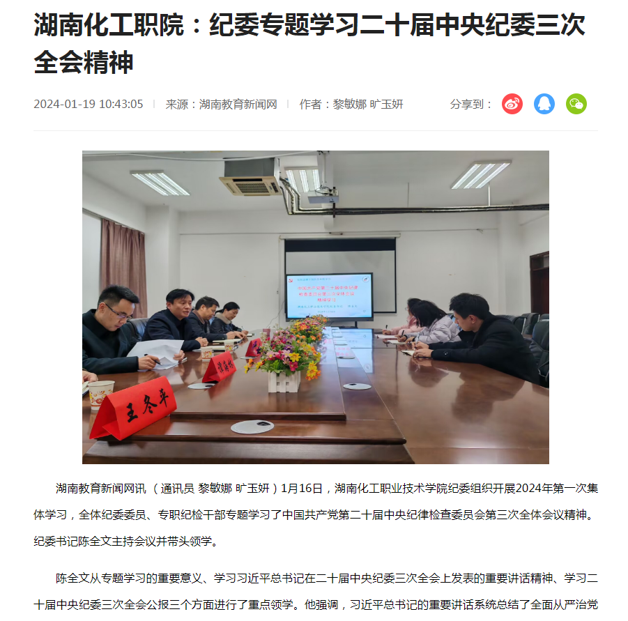 湖南教育新闻网:湖南化工职院:纪委专题学习二十届中央纪委三次全会精神