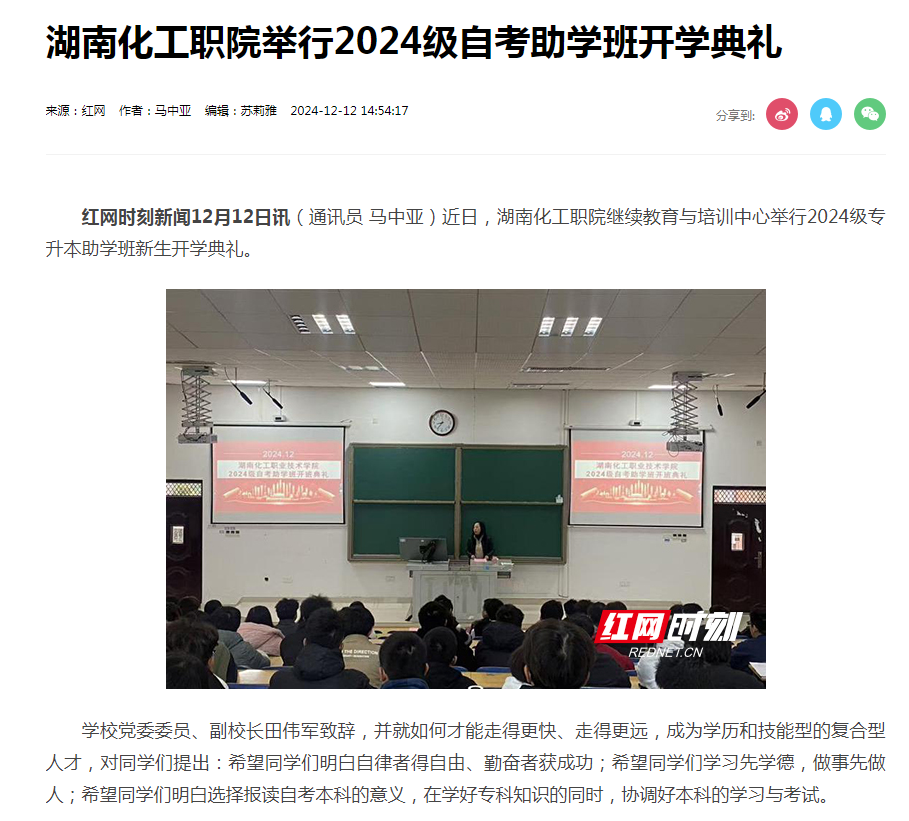 红网:湖南化工职院举行2024级自考助学班开学典礼