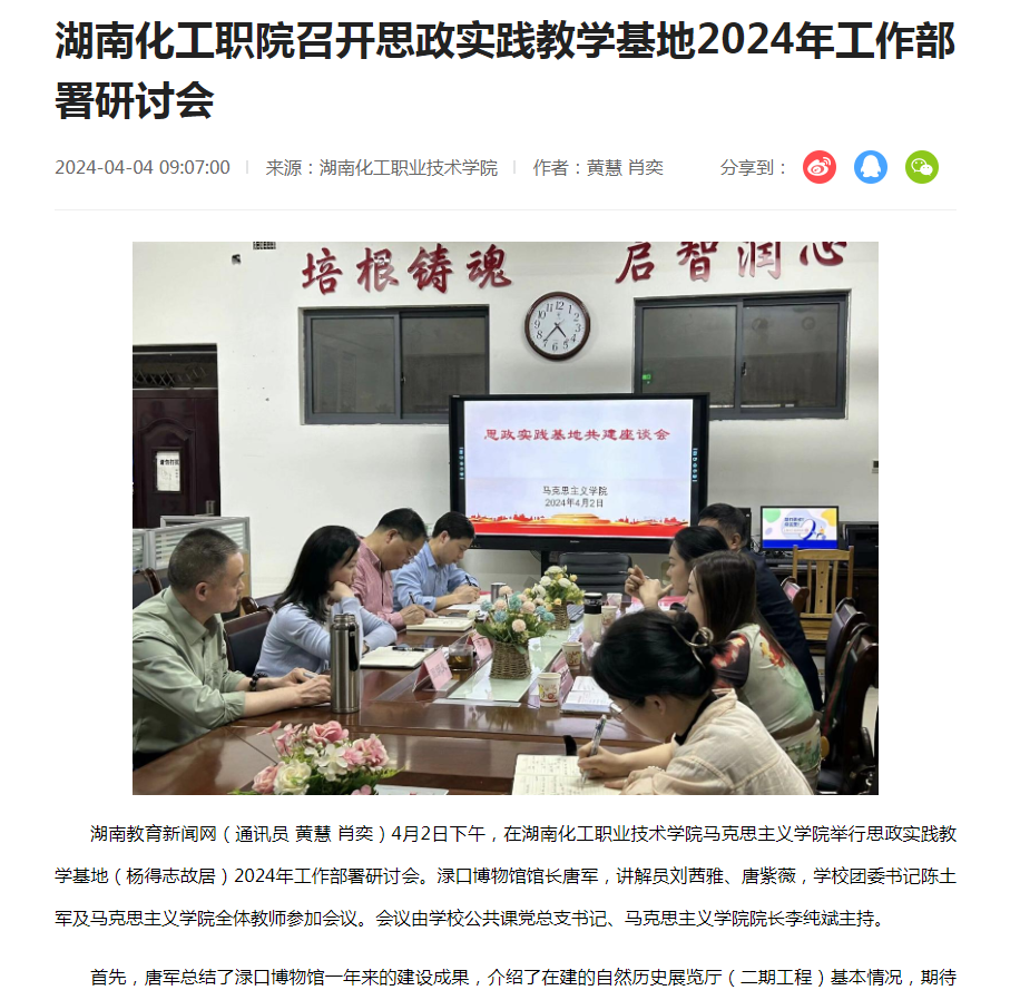 湖南教育新闻网:湖南化工职院召开思政实践教学基地2024年工作部署研讨会