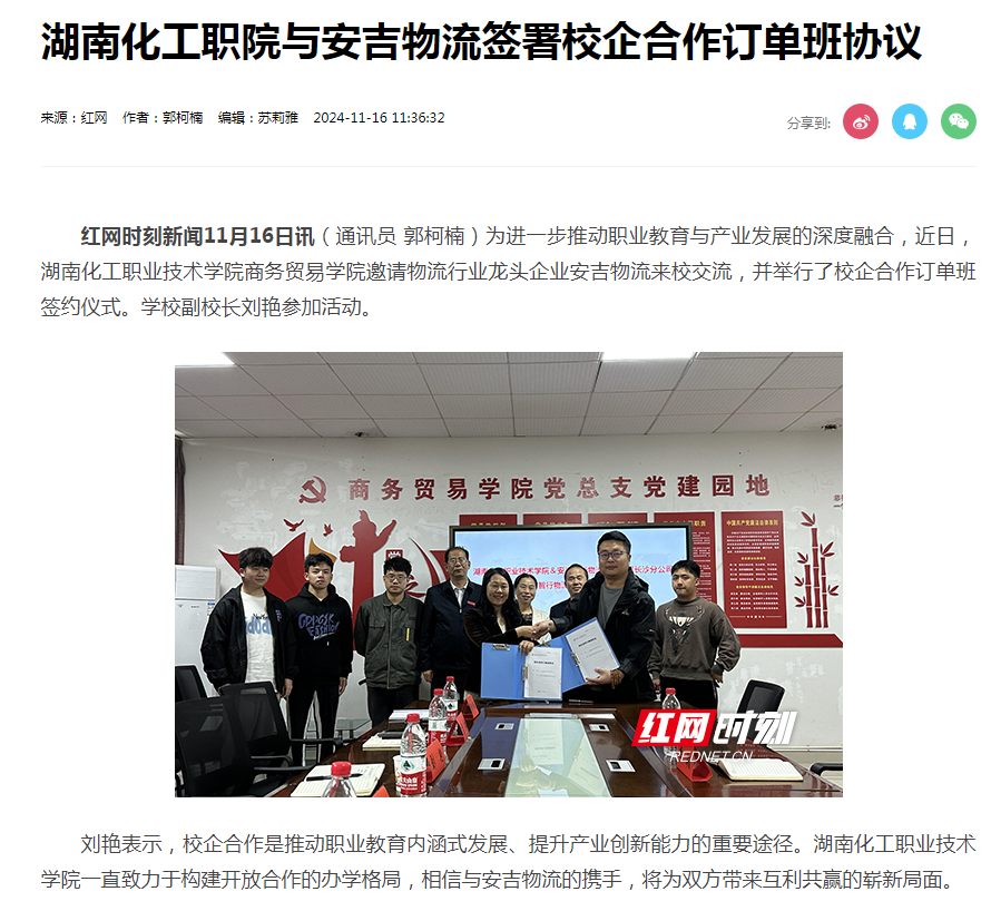 红网:湖南化工职院与安吉物流签署校企合作订单班协议