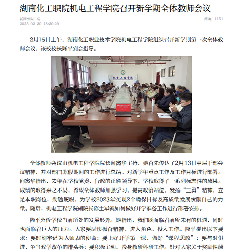 2月15日上午,湖南化工职业技术学院机电工程学院组织召开新学期第一次全体教师会议,该校校长隆平到会指导。