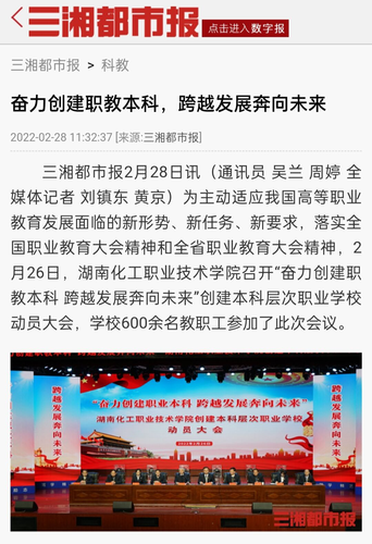 三湘都市报2月28日讯(通讯员 吴兰 周婷 全媒体记者 刘镇东 黄京)为主动适应我国高等职业教育发展面临的新形势、新任务、新要求,落实全国职业教育大会精神和全省职业教育大会精神,2月26日,湖南化工职业技术学院召开“奋力创建职教本科 跨越发展奔向未来”创建本科层次职业学校动员大会,学校600余名教职工参加了此次会议。