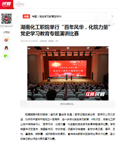 红网:湖南化工职院举行“百年风华,化院力量”党史学习教育专题演讲比赛
