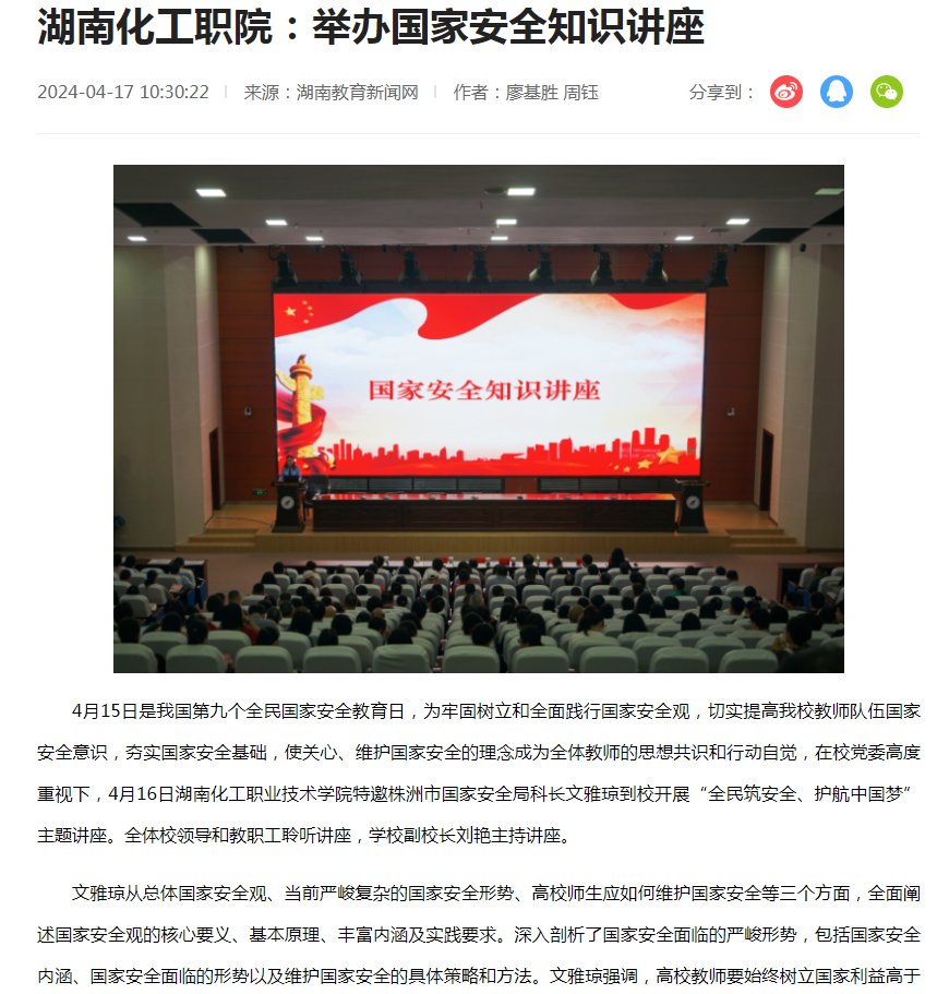 湖南教育新闻网:湖南化工职院:举办国家安全知识讲座
