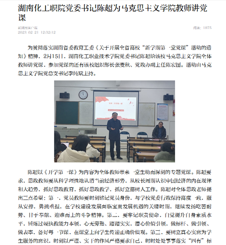 为贯彻落实湖南省委教育工委《关于开展全省高校“新学期第一堂党课”活动的通知》精神,2月15日,湖南化工职业技术学院党委书记陈超给该校马克思主义学院全体教师讲党课,参加党课的还有该校组织部长张麦秋、党政办副主任陈宏图。活动由马克思主义学院党总支书记李纯斌主持。