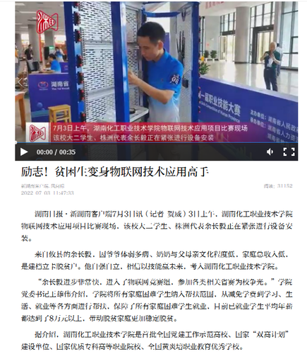 来自攸县的余长毅,因爷爷体弱多病、奶奶与父母亲文化程度低,家庭总收入低,是建档立卡脱贫户。他自强自立,相信以技能赢未来,考入湖南化工职业技术学院。