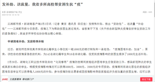 三湘都市报·新湖南客户端3月2日讯(记者 黄京 通讯员 田炆佳)发特殊补贴、推出“资助包”、送流量“补给包”……三湘都市报今日获悉,疫情之下为帮助贫困生渡过难关,省教育厅下发《关于抗击新型肺炎疫情做好学生资助工作的紧急通知》,我省多所学校也纷纷推出暖心举措。