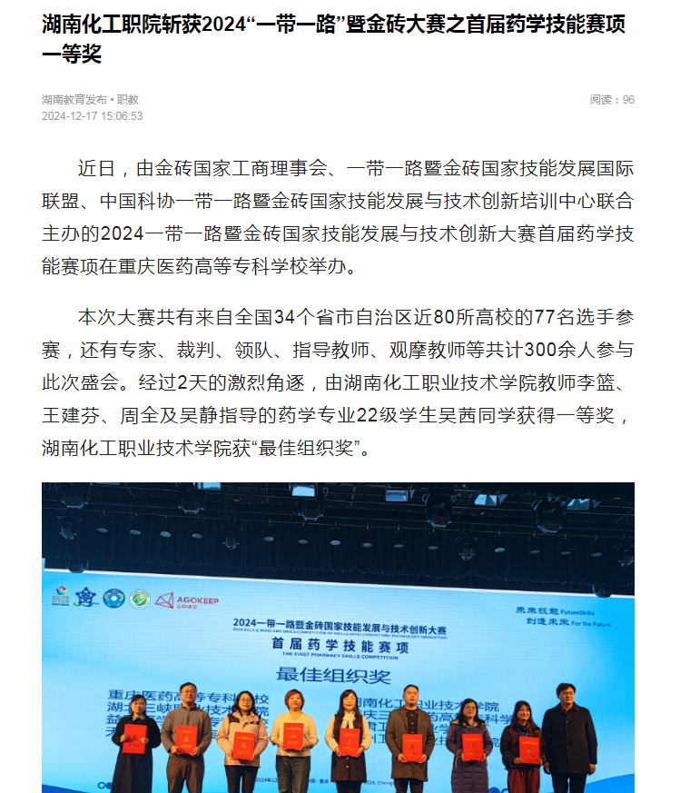 湖南教育发布:湖南化工职院斩获2024“一带一路”暨金砖大赛之首届药学技能赛项一等奖