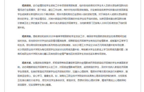 精准资助。提前谋划和安排2020年春季学期国家助学金发放工作,确保各学段国家资助资金在停课期间也能按时发放。各地各校针对学生的实际情况精准施策,保障家庭经济困难学生有效应对疫情影响,能够基本正常学习和生活。部分高校因校制宜推出系列特色化的资助措施,如长沙理工大学设立10余万元网络流量补助专项经费,长沙民政职业技术学院为每位贫困学生发放50G的网络流量补助,帮助解决学生在家线上学习的网络流量问题;湖南机电职业技术学院为湖北籍以及其他部分疫情严重地区的贫困学生发放往返车费专项资助。