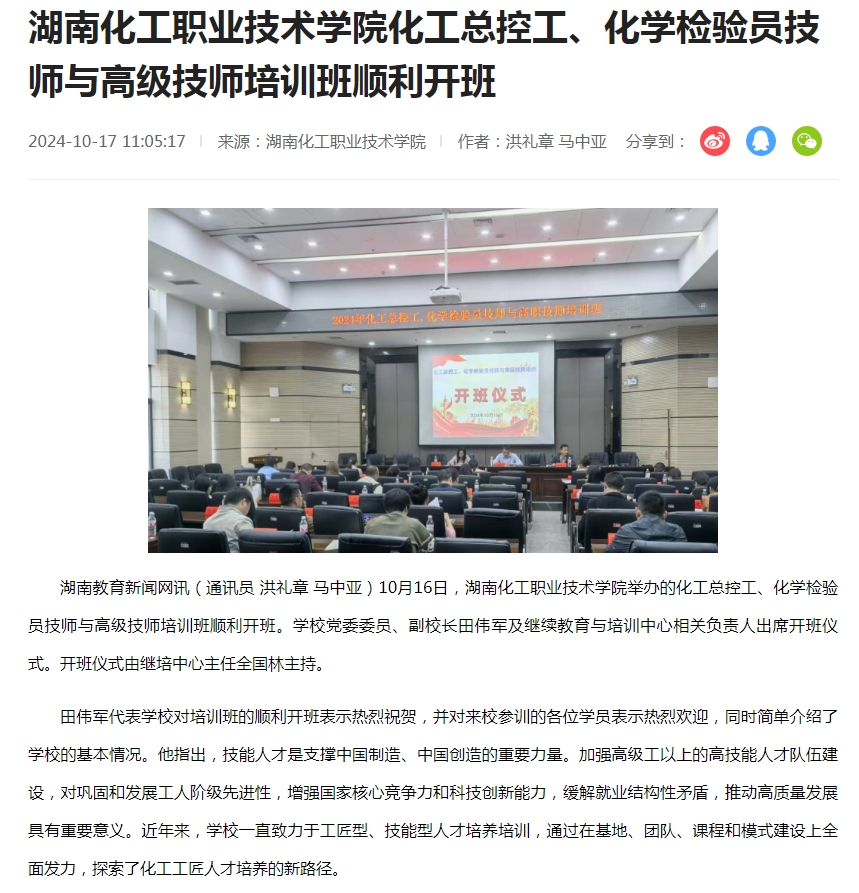 湖南教育新闻网:湖南化工职业技术学院化工总控工、化学检验员技师与高级技师培训班顺利开班