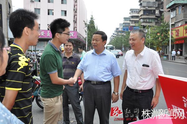 湖南化工职业技术学院院长刘望在株洲汽车南站迎新点与志愿者亲切握手