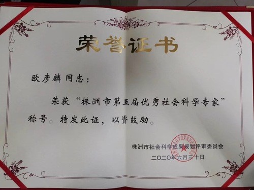 株洲市优秀社会科学专家、优秀青年社会科学专家评选活动是株洲市社会科学的最高奖励,以中共株洲市委、株洲市人民政府名义颁发,每两年评选一次。本次评选坚持公开、公平、公正的原则,发现、选拔、培养社会科学优秀人才,为株洲市经济社会发展提供智力支撑和人才保障,也为表彰株洲市哲学社会科学界政治立场坚定、学术造诣深厚、研究成果丰硕的优秀社会科学理论人才,按照《株洲市哲学社会科学评选奖励办法》和《株洲市第五届优秀社会科学专家、优秀青年社会科学专家评选方案》的评选条件,经个人申报、组织推荐、材料审核、专家评审、终评审定、结果公示等程序,共评选表彰了5名优秀社会科学专家、3名优秀青年社会科学专家,湖南化工职业技术学院欧彦麟研究员、罗源副教授获此殊荣。