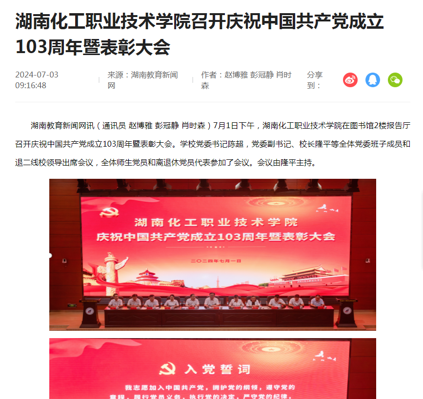 湖南教育新闻网:湖南化工职业技术学院召开庆祝中国共产党成立103周年暨表彰大会