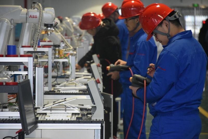 全国首次工业机器人应用编程1+X证书考核在湖南化工职业技术学院顺利开考,该校学生正在进行实操考核